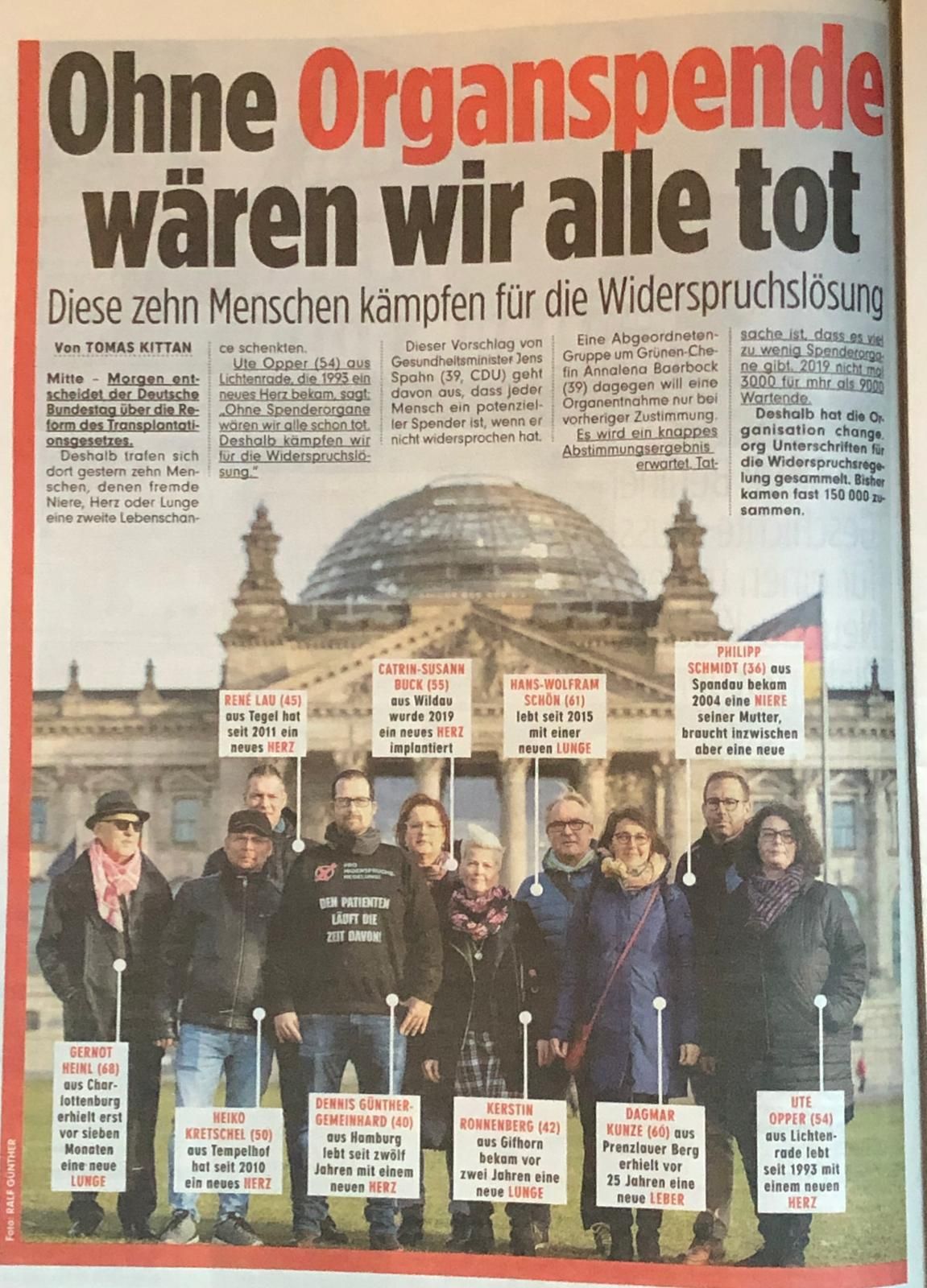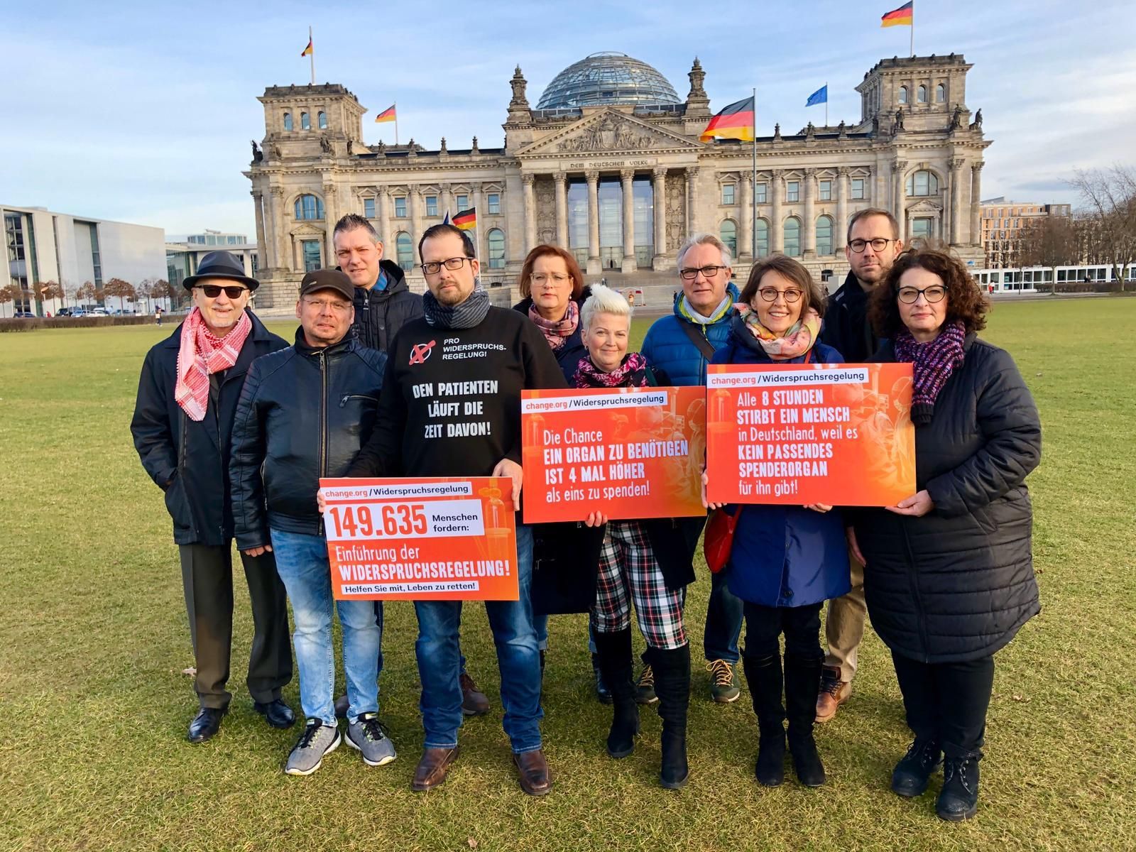 Schon 2020 wurde über die Einführung der Widerspruchsregelung diskutiert und transplantiert e.V., hatte vor dem Reichstags Gebäude, klar Position für Wartepatienten und -patientinnen bezogen. (Bilder: Januar 2020 vor dem Reichstag in Berlin stehen Mitglieder von transplantiert e.V. mit Plakaten). Leider kam es damals nicht zu dieser Veränderung und andere, beschlossene Massnahmen zeigen wenig Erfolg.